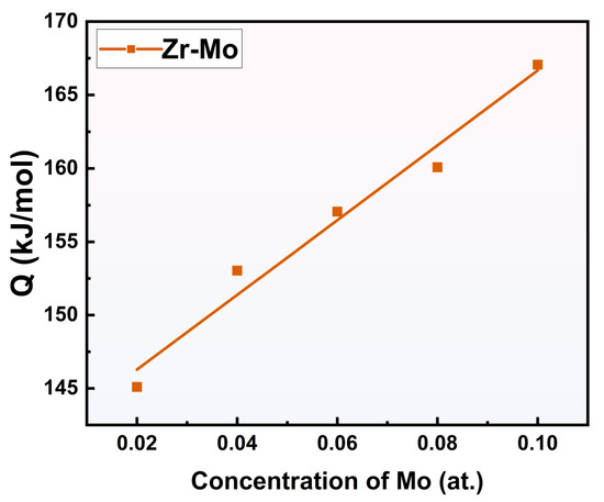 Activation energy corresponding to different concentrations of elements in (Zr, Mo) solid solution phase.
