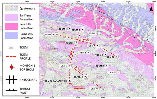 Figure 2), while Profiles B and C were placed perpendicular to Profile A. All TDEMs reached a minimum penetration over 3000 m, enough to reach the hanging wall and footwall of the Basbastro Formation and reach the Mesozoic local basement. TDEM is very sensitive to the conductive layers [