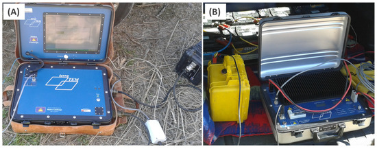 Figure 3). The Terra TX-50 transmitter delivers an output voltage of 96 volts and 50 A transmitter current, with a GPS synchronization module. A coincident-loop 600 m × 600 m square configuration was selected to obtain higher penetration and better signal to noise levels at late points, allowing a more reliable apparent conductivity estimation at depth [