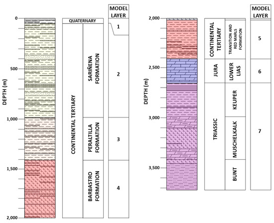 Layer 1 consists of quaternary materials, with a thickness of 54 m. Layer 2 corresponds to continental tertiary materials of the Sariñena Formation, mainly silts, mudstones and sandstones, extending between 54 and 982 m deep. Under this layer, the materials of the Peraltilla Formation appear in layer 3, similar to the previous layer but with a higher relative proportion of sandstones. This layer extends to 1433 m depth, comprising the first meters of the Barbastro Formation, with low salt and gypsum content. Layer 4 consists of the most saline and evaporitic part of the Barbastro Formation, with predominance of anhydrite and massive salty layers. The layer is 601 m thick, extending between 1433 and 2034 m deep. Layer 5 constitutes the transition layer between the bottom non saline part of the Barbastro Formation with the Red Marls Formation, up to the Jurassic, showing a thickness of 413 m. The Jurassic limestones is layer 6, located between 2447 and 2656 m depth. The last layer, layer 7, contains all the Triassic materials up to the end of the drilling, composed of clays, evaporitic materials, sandstones and limestones.
