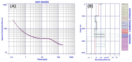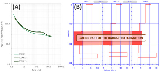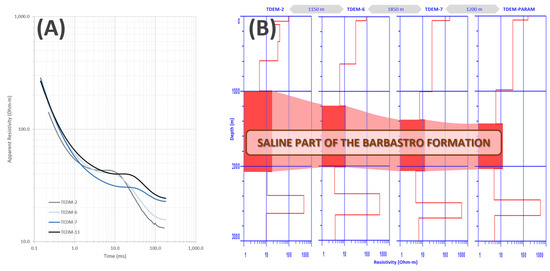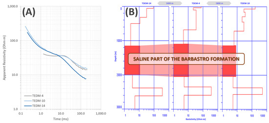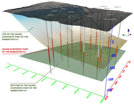 Therefore, our study has revealed that the TDEM research method can be an important tool to study saline-evaporitic formations affected by major geological structures, such as the Barbastro-Balaguer Anticline. The new TDEM structural and geoelectrical data would be useful for allocating and designing mining drills at a region of interest for the exploitation of potassium salts in new mining projects.