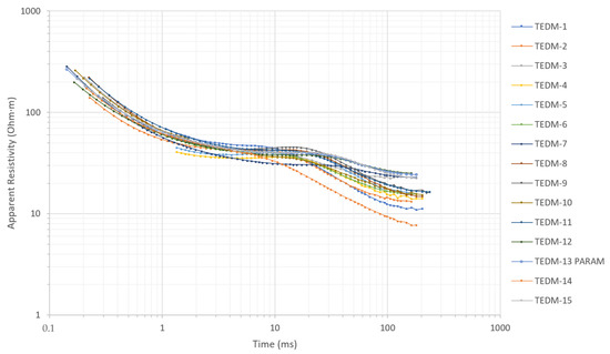 Figure 7) to obtain the geoelectric resistivity–depth columns. RMS% residuals error obtained for all the TDEM survey presents acceptable values, between 0.64–1.88%.