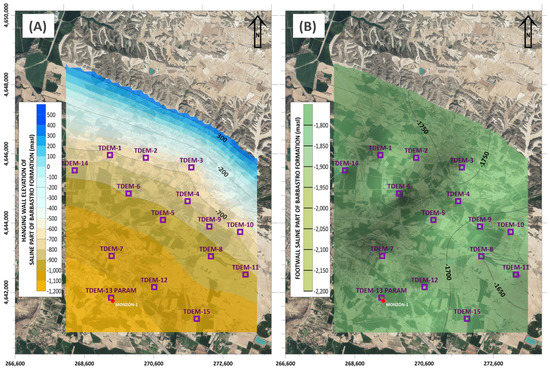 Figure 11 integrates all interpreted TDEM points, showing the spatial elevation of the hanging wall and footwall of the saline-evaporitic Barbastro Formation in the survey area. In case of the hanging wall surface, the outcropping mapped position based on the official geological cartography 1:50,000. Magna [