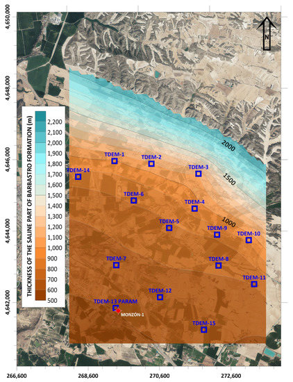 Once the hanging and footwall surfaces have been obtained, the saline-evaporitic part of the Barbastro Formation thickness can be calculated, which ranges between 601 and 1103 m in the TDEM survey points, decreasing in the SW direction according to regional anticlinal defined structure (