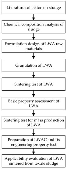 In this study, the research was divided into two stages: laboratory-scale sintering and large-scale sintering. In the laboratory-scale stage, the chemical composition of water purification sludge and textile sludge was first analyzed in order to evaluate their suitability for sintering them into LWAs. In addition, according to the chemical composition suggested in the literature, the proportion of lightweight aggregate raw materials for mixing the water purification sludge with different contents of textile sludge was planned. Then, the sintering test was carried out, and the optimal sintering temperature was analyzed based on the particle density, water absorption rate, and ignition loss of lightweight aggregate, so as to judge the feasibility of producing synthetic LWAs with textile sludge. After completing research trials in the laboratory, the feasibility of the large-scale production of LWAs using water purification sludge blended with textile sludge was evaluated in a commercially available kiln. Furthermore, the engineering properties of the concrete made from the produced LWAs were tested and examined. The overall process is shown in Figure 1.