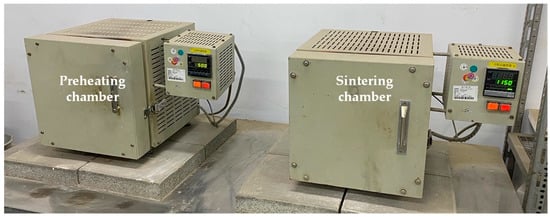 The dried WPS and textile sludge were crushed into powder by a crusher, and then mixed with water in a mixer. The uniformly mixed sludge was granulated into green pellets with a diameter of around 12 mm, as shown in Figure 3. Using the two-stage rapid heating method, the dried green pellets were placed in an aluminum oxide basin for heat treatment. Two programmable high-temperature furnaces were used for preheating and for the sintering of the aggregates, respectively, as shown in Figure 4. The sintering process of the aggregate green pellets is shown in Figure 5. The green pellets were put into an oven and dried at 105 °C for 24 h. The preheating temperature was fixed at 500 °C, and the preheating time was 5 min. The sintering time was fixed at 12.5 min, and the sintering temperatures were 1150 °C, 1175 °C, and 1200 °C, respectively. Under the aforementioned conditions, the effects of different sintering temperatures on the properties of lightweight aggregates were discussed.
