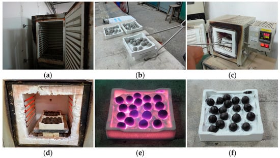 Figure 5. Sintering process of the aggregate green pellets: (a) drying in an oven, (b) dried pellets, (c) putting in the preheating chamber, (d) putting in the sintering chamber, (e) air cooling, (f) aggregates after cooling.