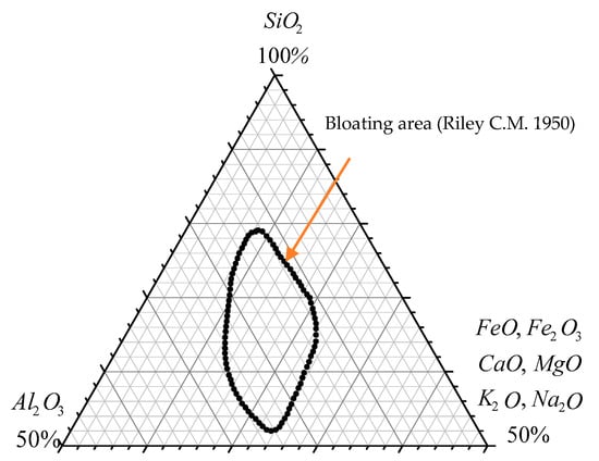 The key to the bloat of lightweight aggregates lies in two conditions [44,45]. One is that the material must produce a high-temperature glassy phase with a viscosity high enough to trap the gases released as the mineral decomposes. Another is that a substance must be present to release the gas at the temperature at which the glassy phase is formed. Riley proposed a three-phase diagram of the chemical composition of raw materials, as is shown in Figure 6 [46]. The “bloating area” suggested in the diagram can help identify whether the composition of the sludge material meets the requirements for bloating. Therefore, the content of silicon dioxide (SiO2), aluminum oxide (Al2O3), ferric oxide (Fe2O3), fluxing oxides (fluxing), and the ratio of (SiO2 + Al2O3)/fluxing of each sludge component will be discussed, respectively, in the following section in order to understand the feasibility of sintering these various sludges into lightweight aggregates. Table 2 shows the percentages of the various sludge chemical components that were obtained via XRF analysis.