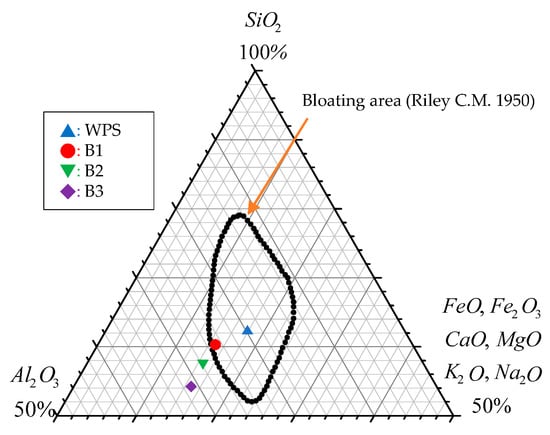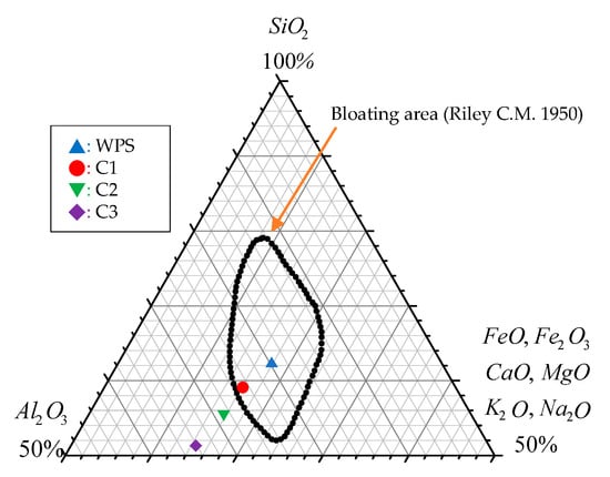 • According to the “bloating area” of Riley’s three-phase diagram designed to assess the chemical composition of lightweight aggregate raw materials, it was feasible for the water purification sludge to be sintered into lightweight aggregates. In contrast, the SiO2 content of the three textile sludge samples was too low to show up in the “bloating area”;