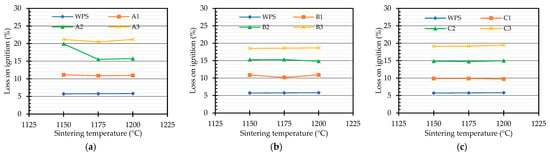 Figure 11. Relationship between the loss on ignition and the sintering temperature for water purification sludge blended with textile sludge: (a) Sample A; (b) Sample B; and (c) Sample C.
