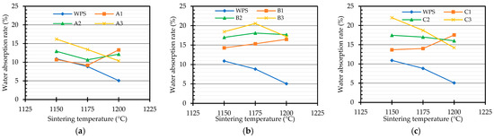 Figure 12. Relationship between the water absorption rate and sintering temperature for the water purification sludge blended with textile sludge: (a) Sample A; (b) Sample B; and (c) Sample C.