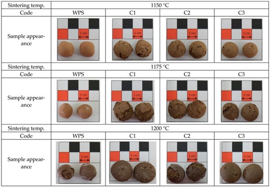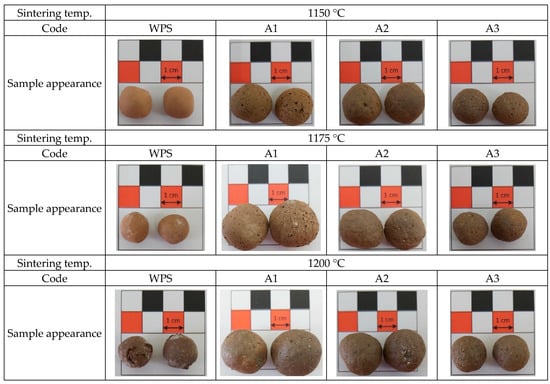 The appearance of the sintered aggregates of the water purification sludges blended with textile sludge from Sample A, Sample B, and Sample C are shown in Figure 14, Figure 15 and Figure 16, respectively. From the appearance of the aggregates in these figures, it can be seen that no matter what kind of textile sludge was used as an auxiliary material, the sintered product did not have a large volume change, and that no phenomenon of over-burning or sticky particles occurred. These are lightweight aggregates with complete particle sizes, and are suitable for use as concrete aggregates. However, compared with that at the lower sintering temperature of 1150 °C, the appearance of the aggregates sintered at 1200 °C was darker. It is presumed that the sintering temperature was close to the over-burning temperature, and the high temperature might cause the aggregate to be over-burned and deformed. Figure 16 shows that when textile sludge from Sample C was added, the appearance of the aggregate had obvious cracks. This result resulted in a greater water absorption in the aggregates (as shown in Table 7), which was not conducive for these aggregates to be used for structural concrete.