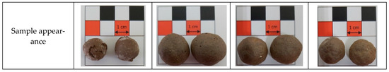 The appearance and texture of the LWAs sintered from different raw material formulations were roughly similar, as shown in Figure 14, Figure 15 and Figure 16. The color of the aggregate was close to reddish brown, which was caused by the change in the valence of ferric ions in the sludge chemical composition at the expansion temperature. In addition, except that the LWAs sintered from Sample C had obvious cracks on the outside, the LWAs sintered from Samples A and B had no obvious cracks, but there were foaming pores inside.