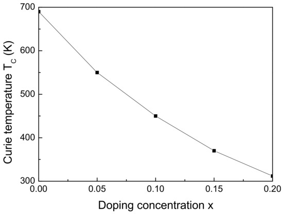 . This result can be confirmed from our model. The ionic radius of Co is larger compared to that of the Fe ion, i.e., the tensile strain that appears leads to a decrease of the magnetization and the Curie temperature. The transition metal ion-doped Fe