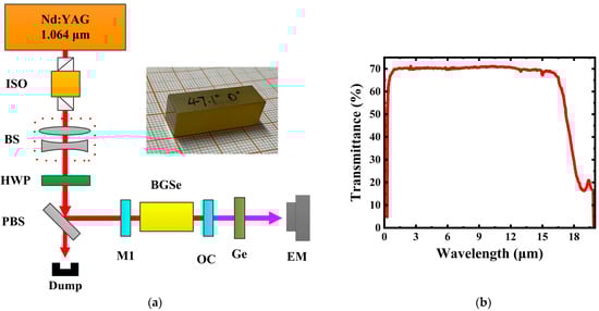 (a) Schematic diagram of the BGSe-OPO pumped by 1064 nm Nd:YAG oscillator laser. Inset: photograph of the adopted BGSe crystal. ISO: optical isolator; BS: beam shaper; HWP: half-wave plate; PBS: 45° polarized beam splitter; M1: input plane coupler; OC: output plane coupler; Ge: germanium filter; EM: energy meter. (b) The transmittance curve of the uncoated BGSe sample with a thickness of 15 mm.