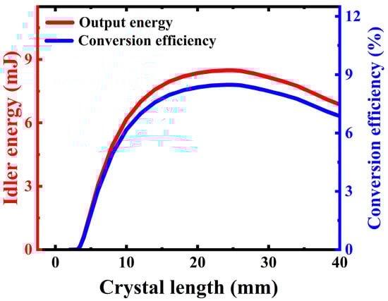 Considering the optical characteristics of the BGSe crystal, the OPO numerical simulation in the DP-SRO is carried out based on the above three-wave mixing theory in SNLO free program by the Fourier transform and Cash–Karp Runge–Kutta method []. The relationship between idler output characteristics at 6.45 μm and BGSe crystal length including output energy and o-o conversion efficiency is plotted under given input pulse energy of ~100 mJ for the pump beam diameter of 6 mm, as shown in Figure 2. It can be seen that the idler output energy (red solid line) and o-o conversion efficiency (blue solid line) both increase gradually up to the highest values of ~8.5 mJ and 8.5%, respectively, at the crystal length of ~25 mm. Subsequently, the saturation effects on both output pulse energy and o-o conversion efficiency appear for longer crystal owing to the back conversion effect. It can be found that choosing the suitable length of the NLO crystal can improve the o-o conversion efficiency and output pulse energy. Therefore, we employed an optimal 25 mm long BGSe with an aperture of 8 × 8 mm2 as OPO NLO crystal in the following experiment, which was grown by the improved Bridgman–Stockbarger method, as illustrated in the upper right inset of Figure 1a.