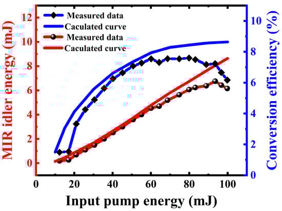 Meanwhile, the simulated idler output energy (red solid line) and o-o conversion efficiency (blue solid line) as the functions of the input pump energy are also depicted in Figure 3. It can be seen that the measured data are in close agreement with the calculated results for the pump energy of less than 62 mJ. Afterward, the o-o conversion efficiency in theoretical simulations showed saturation phenomena such as the experimental measurement. However, with the pump energy further increasing to around 93 mJ, the calculated results were a little higher than the measured values. Moreover, no rollover behavior was exhibited in the theoretical simulation. The deviation could be mainly attributed to ignoring the thermal effect in the numerical model.