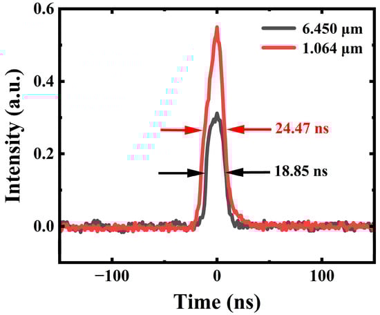 In addition, Figure 5 illustrates the temporal profiles of pump and idler pulses under the maximum output energy. They were measured by InGaAs (DET10A/M, THORLABS, rise time <1 ns, 200~1100 nm) and HgCdTe (PDAVJ10, THORLABS, 2.0~10.6 μm, bandwidth 100 MHz) detectors, respectively. Both collected temporal signals were recorded by a 2 GHz bandwidth digital oscilloscope (Tektronix, MSO 5204B, Beaverton, OR, USA). The measured pulse durations (FWHM) of the pump and the idler light are 24.47 ns and 18.85 ns, respectively. The idler pulse width is narrower than the pump pulse width resulting in the temporal gain narrowing effect in the OPO process []. Hence, the short pulse duration and high pulse energy bring about the MIR 6.45 μm laser having a high peak power of about 358.6 kW at the maximum output level.