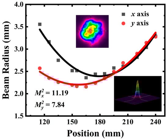 The measurement of beam quality factors M2 for the idler beam at 6.45 μm was carried out at the output energy of 4.5 mJ. The exit idler beam radii in the horizontal (x) and vertical (y) directions were measured at different distances from a CaF2 convex lens of f = 100 mm after OC mirror by a commercial MIR charge-coupled device (CCD) camera (Spiricon, PY-Ⅲ-HR-C-A). The plot in Figure 6 displays the measured beam caustic along the x (black squares) and y (red dots) transverse directions in terms of Gaussian approximation. By fitting the Gaussian beam standard expression, the beam quality values were calculated to be about 11.19 and 7.84 in x and y directions, respectively, corresponding to an average beam quality factor of M2 = 9.52. The insets of Figure 6 show the two-dimensional (2D) and three-dimensional (3D) spatial beam intensity profiles. It also indicated that the generated beam of the MIR wave has a good Gaussian spatial distribution, which is crucial for surgical applications.