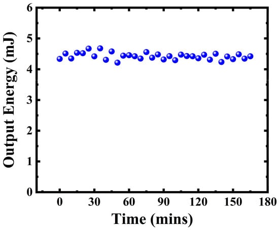It is worth mentioning that the stability of the idler output energy was also evaluated by an energy meter when the output energy was ~4.5 mJ. The measured results are shown in Figure 7, which demonstrates that the fluctuation of idler output energy was less than ±0.5% over 165 min. The excellent stability of the MIR light source is essential to the ablation of biological tissues. The stability of MIR laser output could be potentially further improved by controlling the stable output of the pump source.