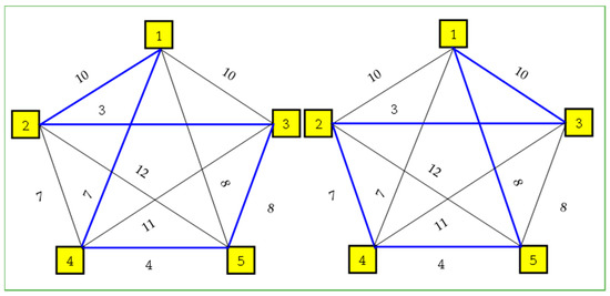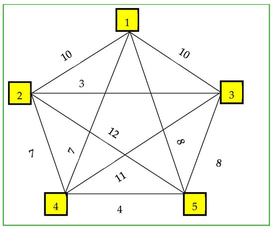 A five-node network is presented in Figure 3, this network is used to demonstrate the ability of the proposed method to determine the alternative optimal tour. The respective distance matrix is shown in Table 7. Node 1 is considered as the home city.