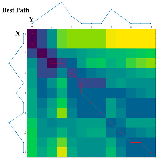 can be obtained by solving this dynamic programming problem. The best path of the dynamic warping process is shown in