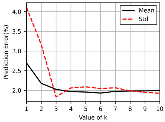 k value on the prediction results, a total of 600 historical batches were split into two parts: the 100 batches with the closest dates were used for model validation, whereas the remaining batches were used for the retrieval of similar batches. The model’s prediction error (root mean square error, RMSE) with different values of