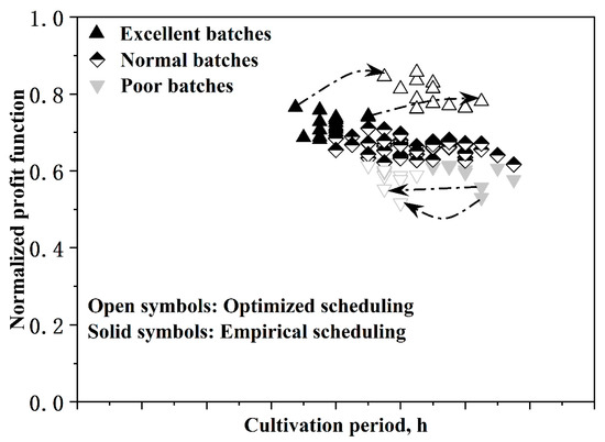 The effectiveness of the entire strategy is evaluated using pseudo-online simulation, which is carried out with the process data of 90 industrial batches. The inoculation sequences of these batches are assumed to be the same with empirical scheduling. For online scheduling, after the strategy is practiced, the actual process data can be obtained through measurement. However, for pseudo-online simulation, the process data after the optimized scheduling is not available. Therefore, the termination time and profit function of the corresponding batch are evaluated using Equations (13) and (15), and then the overall profit of the workshop in the scheduling time span can be obtained with Equation (2).