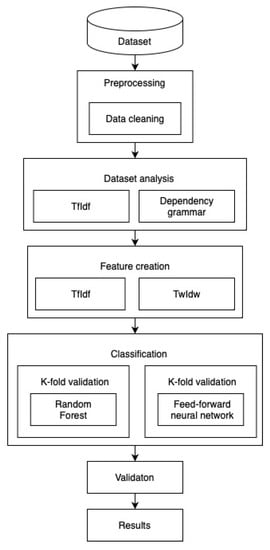 Syntactic analysis, also known as parsing, plays a crucial role in NLP by analyzing the grammatical structure of sentences. The importance of syntactic analysis lies in its ability to understand sentence structure. By incorporating syntactic analysis into NLP systems, the accuracy, interpretability, and overall performance of various language processing tasks are enhanced. Nagy and Kapusta [] pre-processed a dataset of fake and real news using syntactic analysis and used dependency grammar to determine the importance of words within sentences. They created input vectors for classification as TfIdf weighted by dependency grammar depths and compared it with the TfIdf method. Their results show that using dependency grammar information can improve the classification of fake news with acceptable accuracy and even improve existing techniques such as TfIdf.