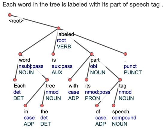 The emphasis of this study lies in examination at the syntactic level, encompassing the relationships between words within a sentence. Syntactic analysis is fundamental for analyzing language at higher levels such as semantic, morphemic, or contextual. Syntax is concerned with identifying sentence elements and their relationships []. In NLP, it is also known as dependency grammar or dependent syntax []. The outcome of dependency analysis is the dependency structure of the sentence, which is often represented in the form of a tree [].