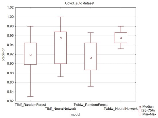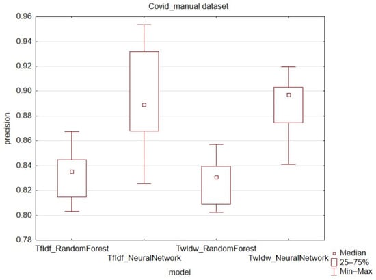 In terms of the precision metric, there were no significant increases in values observed. The achieved minimum precision values were higher in all cases of k-fold validation except for the classification of the political dataset using a neural network (Figure 3, Figure 4 and Figure 5). In the case of the COVID-19 automatic dataset combined with a neural network, the TwIdw technique had the smallest interquartile and variance range. Overall, the best results for precision were achieved using the TwIdw technique on the automatically evaluated COVID-19 dataset. The recall metric also confirms the change of interquartile and variance range (Figure 6, Figure 7 and Figure 8).