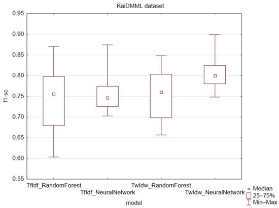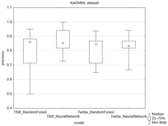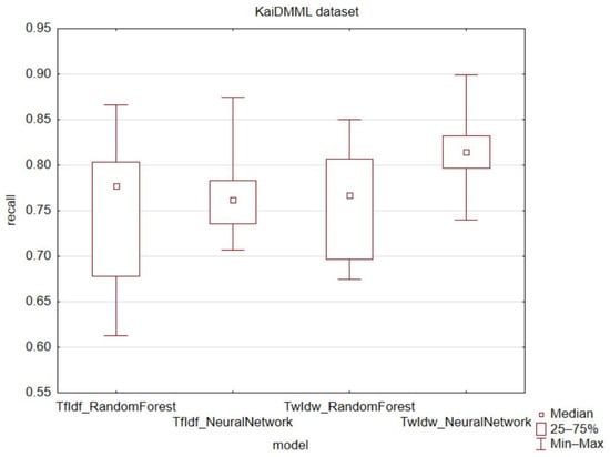For the KaiDMML dataset (Figure 7) and the recall metric, the results were ambiguous for the random forest model, like the previous datasets. However, for the feedforward neural network model, all values were higher (max, min, median, upper quartile, lower quartile). For both models, there was a decrease in the variance and quartile range.