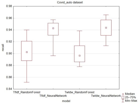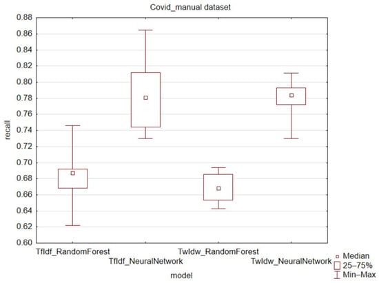 In terms of performance measures, better results were observed in favor of the TwIdw technique, especially for the feedforward neural network model. Recall indicates the rate of correctly identified fake news and real news. It showed better results for the TwIdw technique. In the case of the COVID_auto dataset (Figure 6), the results were inconclusive, especially for the random forest model, where the TwIdw technique showed an increase in the minimum observed value and a decrease in the quartile and variation range. However, the median, upper quartile, and lower quartile values were lower. For the COVID_auto dataset, the feedforward neural network model showed higher median, maximum, and minimum values, as well as higher upper quartile values in favor of the TwIdw technique. For the COVID_manual dataset (Figure 7) and the recall metric, better results were observed for the traditional TfIdf technique in the case of the random forest model. The results for the feedforward neural network model were mixed, with only higher median and lower quartile values observed. However, in both models, the variation range and quartile range decreased for the recall metric.