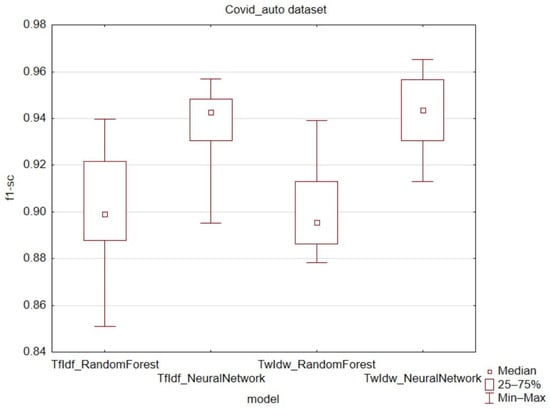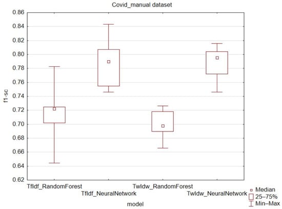 Regarding the f1 score metric, the median value increased, and higher minimum and maximum resulting values were measured. The best classification accuracy values were achieved in the automatically evaluated COVID-19 dataset. The lowest accuracy values for the metric were achieved in the political dataset.