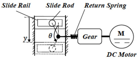 where and represent the electric motor output torque and spring load torque, stated in (4) and (5), respectively; and are the motor torque and back EMF (electromagnetic fields) coefficients, respectively; , R, and represent the armature voltage, motor winding resistance, and spring preload position, respectively; is the nonlinear friction torque; and denotes the nonlinear torque created by the constraint of sliding rail–rod structure based on (6).
