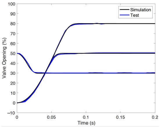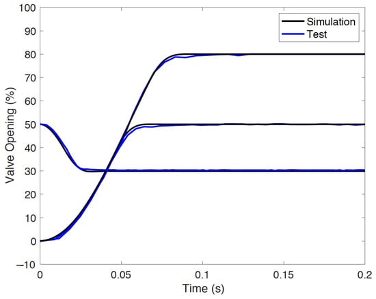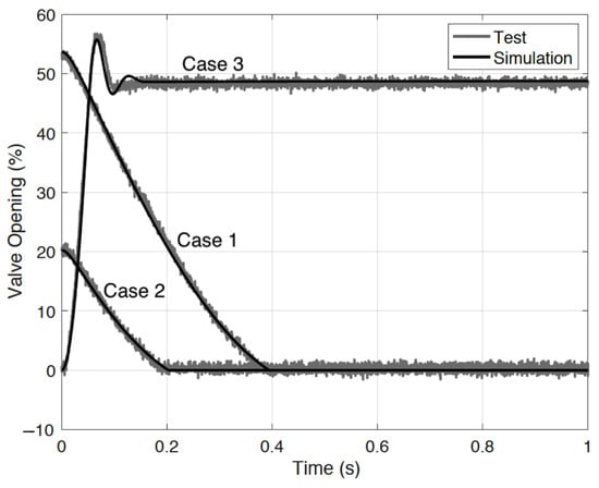 Model coefficient identification is challenging in nonlinear systems. Multiple tests were conducted to isolate the effects of different parameters. First, the controller gain was obtained from valve specification data, then the spring stiffness , spring preload , and viscous friction were estimated by releasing the valve at different positions to generate the estimated Stribeck friction curve. Iterative calibrations were obtained by comparing the simulation and test responses to improve model accuracy. Based on the carefully calibrated model, two free falling cases (52.5% and 20.3% opening to 0%) were then compared using the experimental and model simulation results (Cases 1 and 2). In addition, the experimental closed-loop step response (0% opening to 50% opening, Case 3) using a PID controller (with gains P = 400, I = 0, and D = 0) was compared. The responses were closely matched (see Figure 3), validating the modeling accuracy. Detailed model parameters are shown in Table 1. The parameter units are omitted. as the system identification has been processed as “control input to system output”.