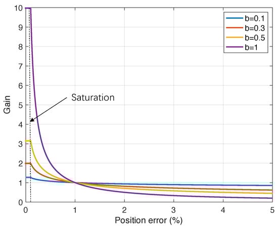 Figure 5 shows the scheduled-gain function with , , and b between 0.1 and 1. It can be seen that as b increases the scheduled gain magnitude increases significantly with a small position error, resulting in a large gain difference between small and large e compared to a relatively small b. With the help of the a (ramp-gain) and c (fixed-gain) parameters, the optimized scheduled gain is able to adapt to the nonlinear system dynamics.