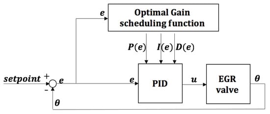 System nonlinearity with varying operating conditions is one of main challenges in PID controller tuning. For example, test results show that a well-calibrated PID EGR valve controller can have a small steady-state error under multiple operational conditions; however, under small valve opening conditions, the relative steady-state error of the valve can increase significantly [5]. The main reason for this is that PID controllers are driven by the position error. Under small opening conditions, the control signal generated by a fixed-gain PID might not be large enough to overcome the high static friction force. To improve PID controller performance, gain-scheduled PID control has been developed with different scheduling strategies [7,8,9], which allows the PID control law to be adapted for systems that experience nonlinear dynamics. However, optimizing the scheduled PID gains to obtain the best performance is challenging. The classical tuning method combines the Ziegler–Nichols [10] method and manual tuning in a heuristic method, making it difficult to achieve optimality, especially for nonlinear dynamic systems with gain-scheduled PID controllers. More advanced optimal design methods for PID control have been developed, including nonlinear PID [11,12,13,14,15,16], fuzzy PID [17,18,19,20,21], etc.