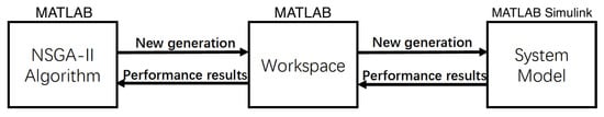 To generate the baseline simulation, MATLAB R2019b software created by MathWorks was used in East Lansing, US (see Figure A1 in Appendix A for the MATLAB Simulink model) for the iterative NSGA-II search. The data were connected through the MATLAB workspace, as both MATLAB and Simulink can read and write data in the MATLAB workspace. The detailed optimal gain-scheduled PID controller search structure using NSGA-II is described in Figure 8, where, as implemented in MATLAB, NSGA-II generates a next generation for each iteration and updates it to the workspace. In addition, the MATLAB–Simulink environment described above was used to evaluate the whole generation and feed the performance results back to MATLAB to obtain the next generation.