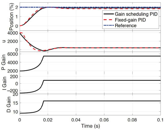 Compared with the fixed-gain PID controller, the (Overshoot) and (ISE) are optimized to 0.0025 and 0.0470, which represents an improvement of 94.2% and 1.9%, respectively. In the detailed cases, regarding the steady-state error, both controllers handle it well in Cases 2, 3, and 4, with all of them being below 1%. Note that for an EGR valve it is desirable to have no overshoot; however, for the small opening case (Case 1), the fixed-gain PID controller has an 8.2% overshoot, compared with 3.8% for the optimal initial gain-scheduled PID controller. In order to find the root cause of this result, a detailed comparison is shown in Figure 12.