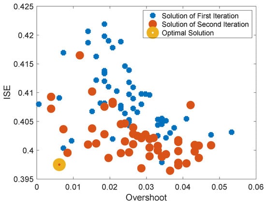 Using the binary crossover probability and distribution index at and with the polynomial mutation probability and distribution index at and from the simulation study, the parameters for the online optimization study are listed in Table 7. Benefiting from the iterative search structure, the initial search space of , , and can be defined in a relatively small range ( here). By evaluating the results of the first search, certain saturations can be observed for , , and near the Pareto front, which leads to search space migration in the second iteration. As can be seen from Figure 16, after migrating the search space, the overall performance of both the whole population and Pareto-front population in the second iteration (the orange dots) are improved over the first iteration (the blue dots). Finally, the yellow circled point is selected as the optimal solution, as it has a minimal distance to the origin and results in improved online optimization of the control performance (see Figure 17). In summary, a comparison of the offline fixed gain (F-G), offline gain scheduling (G-S), and online optimized (O-G-S) PID controller is shown in Table 8.