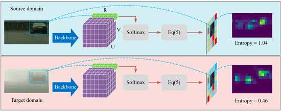 where refers to the feature value at of feature map, . In Figure 3, the feature channel entropy of the feature vector at each pixel position in the feature map represents the uncertainty of the corresponding features in the original image’s receptive field. After training on the source domain, the feature extraction network will extract more effective information, resulting in more differentiation between the elements of the feature vector and a larger result for the feature channel entropy. Conversely, in the absence of training on target domain data, the feature channel entropy will be smaller due to the blurring of texture information in the entire image caused by rainy or foggy weather.