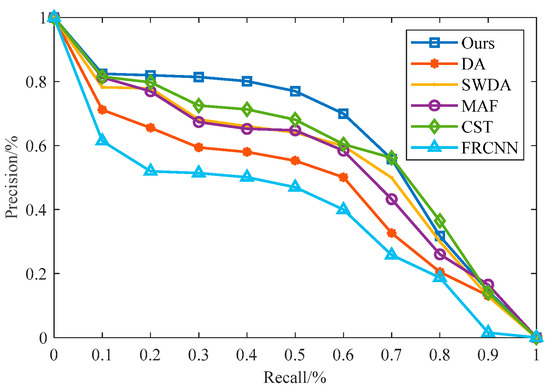 The precision–recall curve of the proposed model in domain adaptation from Cityscapes to Cityscapes foggy is presented in Figure 6. Recall is the ratio of the number of correctly detected objects to all ground truth instances. Precision in Figure 6 indicates the percentage of correctly detected objects at different recall rates. It can be observed that the proposed model exhibits a clear advantage in the [0.2–0.6] interval.