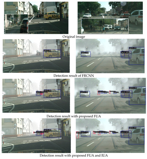 The visual results of Cityscapes to Cityscapes foggy are presented in Figure 9. It can be observed from Figure 9 that the model with the FUA module can detect vehicles and pedestrians that are affected by fog. Furthermore, the application of both the FUA and IUA modules enables the detection of distant targets. In contrast, the FRCNN model without domain adaptation can only detect large objects in close proximity. This demonstrates the effectiveness of the proposed FUA and IUA modules in providing domain adaptation.