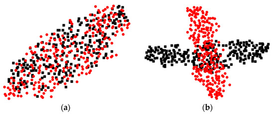 The visual result obtained from backbone via tSNE. (a) tSNE result with adaptive. (b) tSNE result without adaptive. The black squares represent results obtained from the source domain Cityscapes, while the red circles represent those obtained from the target domain Cityscapes foggy.