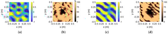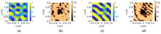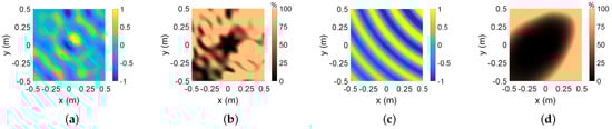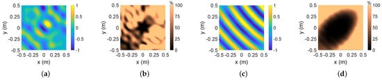 The reconstructedpressure field and the error field controlled by the closed-form solution (P-CFS) and the sparse solution (P-SS) using the sound-pressure-based expansion. (a) Reconstructed pressure field controlled by P-CFS; (b) error field controlled by P-CFS; (c) reconstructed pressure field controlled by P-SS; (d) error field controlled by P-SS.