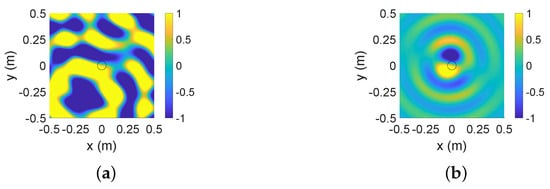 Throughout the simulations, the frequency of the sources is Hz, except the evaluation in terms of the frequency. The sound speed is m/s and the air density is kg/m. The truncation orders of the velocity coefficients in the r, , direction are , , and , respectively, according to the truncation theorem of the velocity expressions []. For the sparse solution, we use a 500 iterations LASSO.