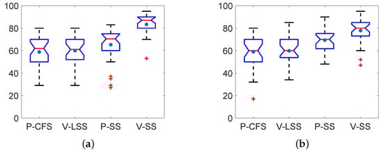 From Figure 12a, we observe that, for the source localization, the closed-form solution of the sound-pressure-based expansion and the least squares solution of the particle-velocity-based mixed-source solution have similar mean values and median values, and their confidence intervals have nearly 100% overlapping. The sparse solutions of both expansions have higher mean values and median values. However, the sparse solution of the particle-velocity-based expansion has a more significant improvement in score and a more centralized score distribution compared to the sparse solution of the sound-pressure-based expansion. Similar results are shown for the basic audio quality test in Figure 12b, where no significant difference is found between the closed-form solution and the least squares solution. For the sparse solutions, the particle-velocity-based expansion is still observed to perform better than the sound-pressure-based expansion; however, both of outperform the closed-form solution and the least squares solution. We also notice that for the sparse solution of the particle-velocity-based expansion the scores in the source localization test are relatively higher than those in the basic audio quality test.