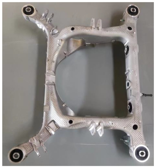 Sample parts in the size of 300 mm × 200 mm were taken from the subframe, as shown in Figure 1. The sample sheets were first cut from the subframe and then milled to the geometry specified in the test standard. The milling process was performed with carbide tools at the appropriate speed and feed rate. The final process was a finishing process to ensure that the roughness of the milled surface was less than Ra 3.2 µm. After milling, the surface of the gauge section was ground with 2000# SiC paper and then slightly polished. The machined specimens were measured by a Coordinate Measuring Machine to ensure dimensional consistency. A fresh sheet of SiC paper was used for each sample, and the polished surfaces were measured with the surface roughness measuring instrument to ensure that the roughness was below Ra 1.6 µm.