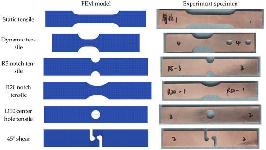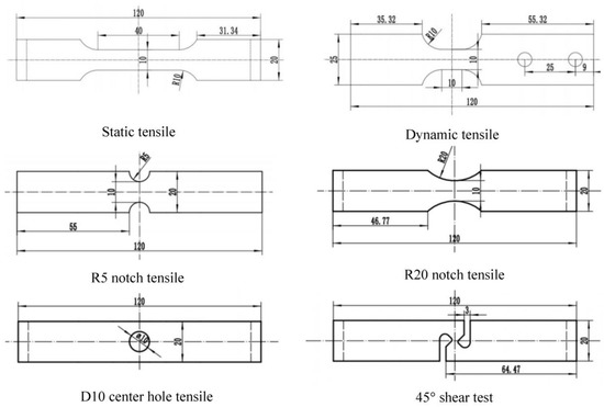 To investigate the relationship between the stress triaxiality and plastic strain at failure, we designed specimens with different geometric shapes: static tensile, dynamic tensile, 45° shear, R5 notch, R20 notch, and D10 center hole specimens, as shown in Figure 2. During the loading process, the triaxiality of each specimen was maintained until the material failure behavior occurred. The stress states were different for each specimen, allowing us to perform a more comprehensive analysis.